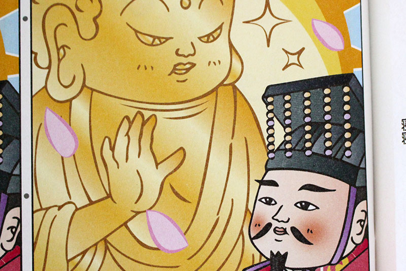 そんな黄金に光輝く盧舎那仏(るしゃなぶつ)と信心深い聖武天皇を、間違い探しのイラストとして描きました。